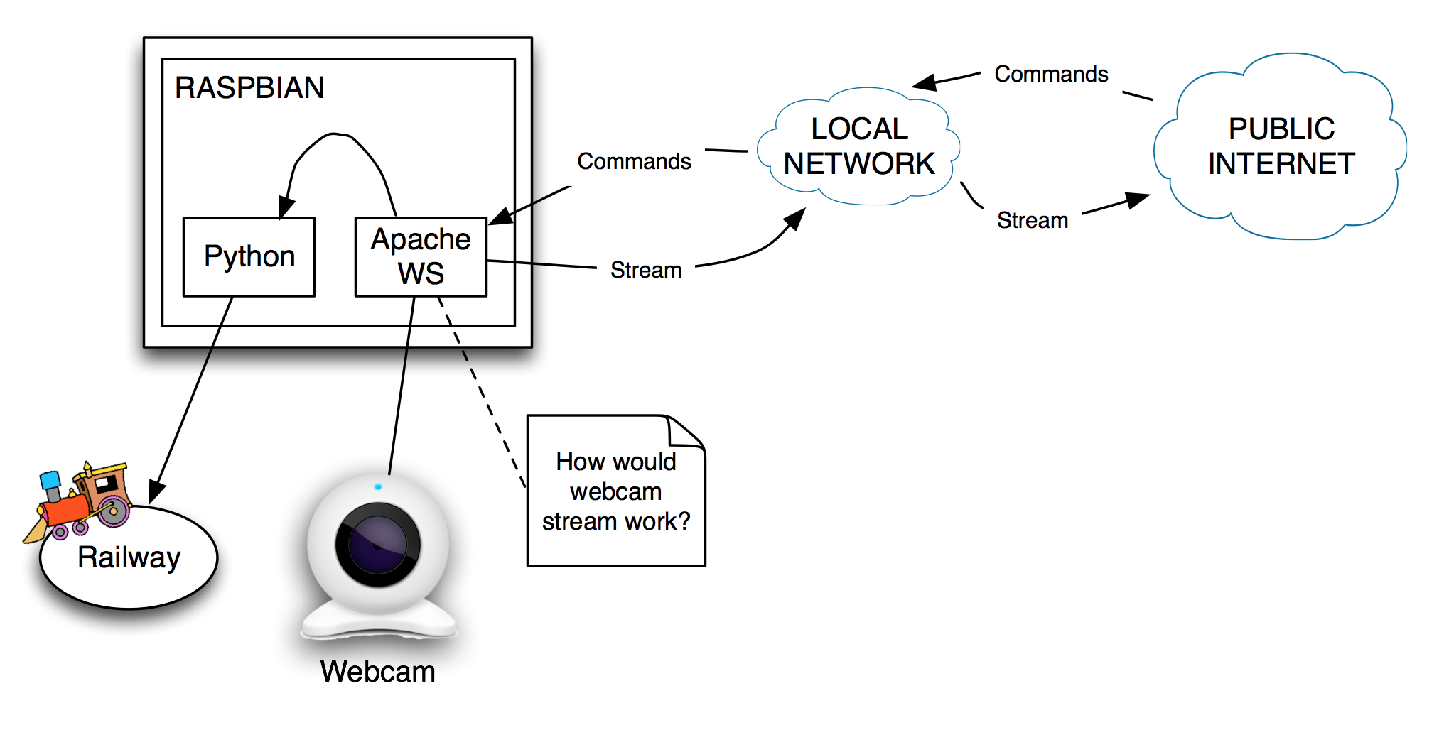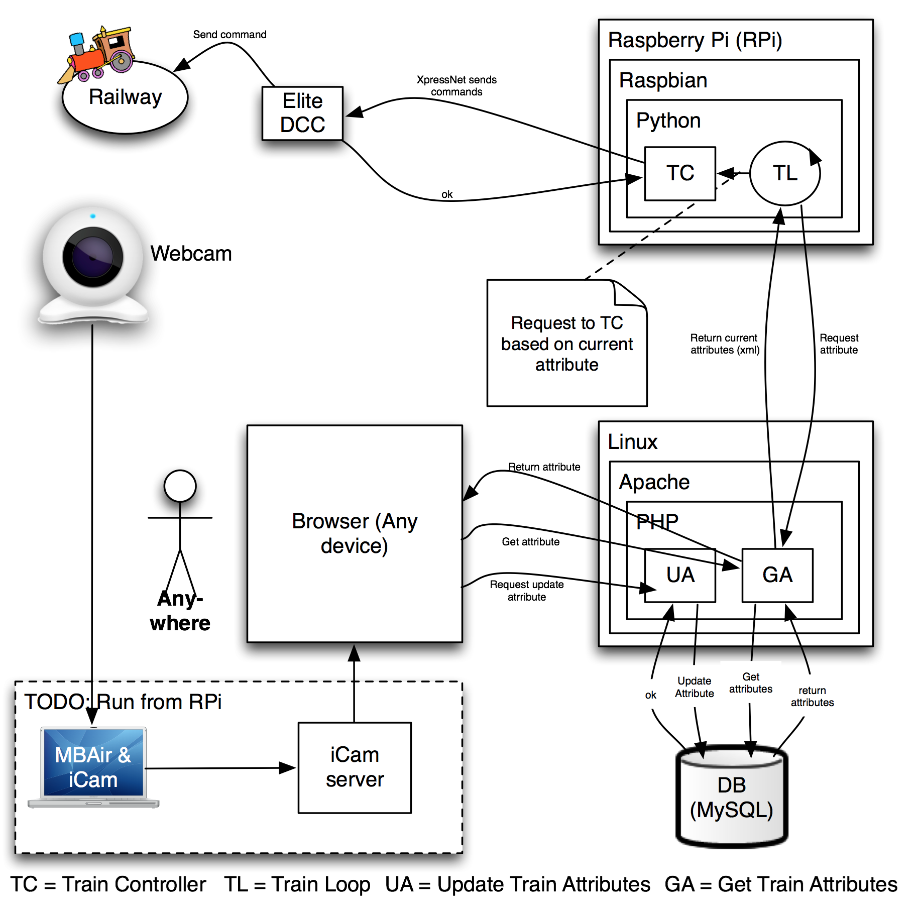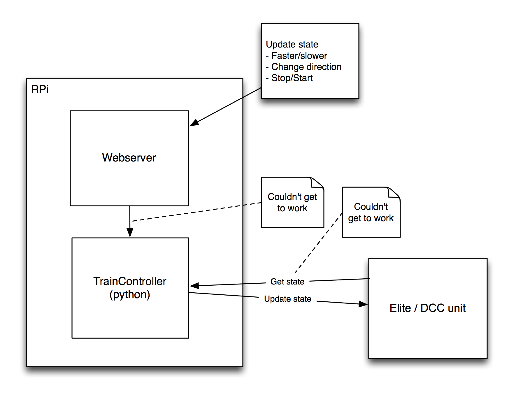 But this required i) to read the state of the train - something I could not get to work correctly. And ii) to send the command to the RPi via a web server on the RPi. But for this I needed to fix the IP of the RPi, get a web server running (which I succeeded at) and then get the Apache to python bridge / module working - which unfortunately I was unsuccessful at. So I went about re-architecting the solution, and this diagram describes the final attempt/solution that I developed.