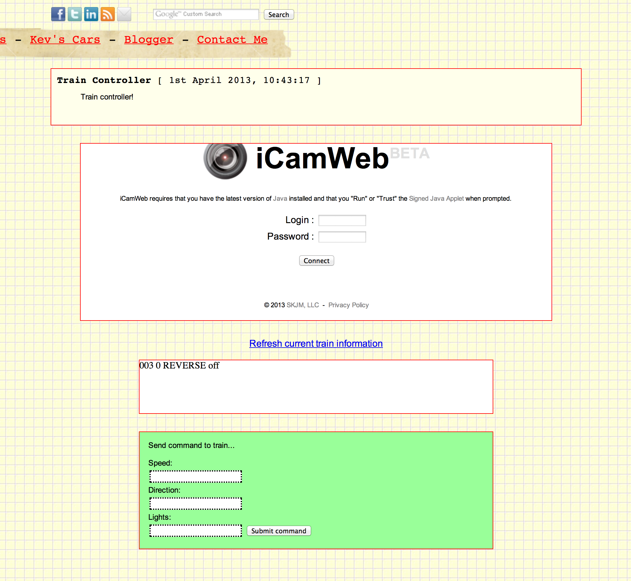 I then wrote a web interface, where you could enter the details of the train; speed, direction and lights on/off, and this would run the php update script, thus controlling the train. Here is a picture of the web interface;